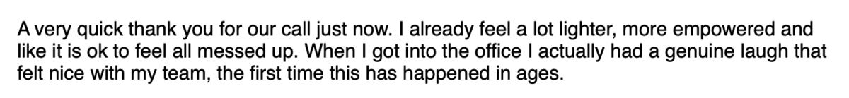 "I realised how much my values shape my work, and how essential self-care is to real success. Most of all, Sarah gets it. She helped me find direction that felt true to me - the kind of support I’d been searching for for years.”