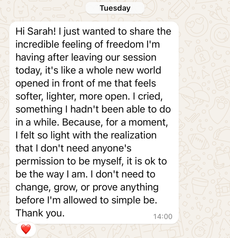 What made the biggest difference was the way she held the space. No matter what came up – even the painful, messy truths – I felt completely safe. I never felt dismissed or judged. I felt genuinely seen.